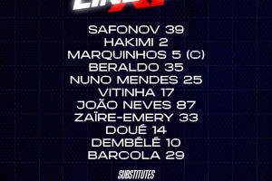 39-萨福诺夫、2-阿什拉夫、5-马尔基尼奥斯、35-贝拉尔多、25-努诺-门德斯、17-维蒂尼亚、87-若昂-内维斯、33-扎伊尔-埃梅里、14-杜埃、10-登贝莱、29-巴尔科拉